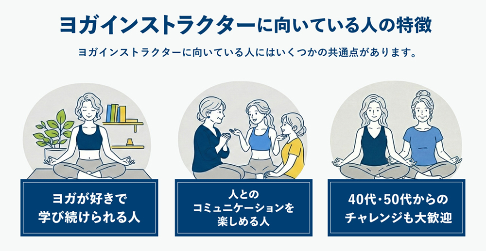 40代・50代だからと言って「若い頃のように体が動かない」と引け目を感じる必要はありません。むしろ、年齢を重ねたからこそ分かる体の不調や、心の揺らぎへの共感は、同世代の生徒さんにとって大きな安心感となります。人生経験そのものが、ヨガインストラクターとしての武器になります。
